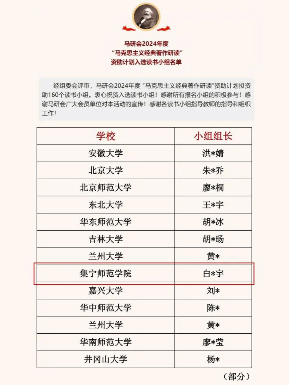 2024年11月8日,中国高等教育学会马克思主义研究分会公布了2024年度“马克思主义经典著作研读”资助小组名单。马克思主义学院成格乐图、韩宁老师指导,白少宇等15名学生申报的“红烛映典,薪火社研”读书小组成功入围。这是我院学生读书小组连续第二年入选该资助计划。
