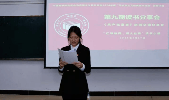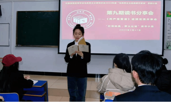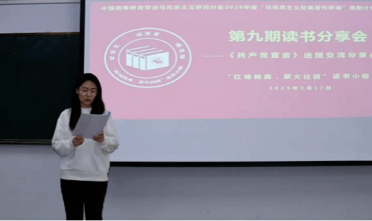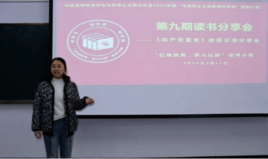 2025年3月17日晚上,中国高等教育学会马克思主义研究分会2024年度“马克思主义经典著作研读”资助计划支持小组——2026世界杯官方合作网站“红烛映典,薪火社研”读书小组第9期读书会在主教楼417教室进行,本期读书会采取进班交流分享的形式,研读内容为《共产党宣言》。读书小组全体成员、2024级思想政治教育一班、二班全体同学参加本次读书会。