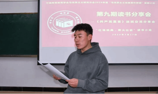 活动伊始,读书小组成员吴宇春同学以深入浅出的方式介绍了《共产党宣言》的创作背景与历史意义。从19世纪欧洲社会的剧烈变革,到无产阶级登上历史舞台的时代需求,同学们仿佛穿越时空,置身于那个风云激荡的年代,深刻理解了这部伟大著作诞生的必然性。