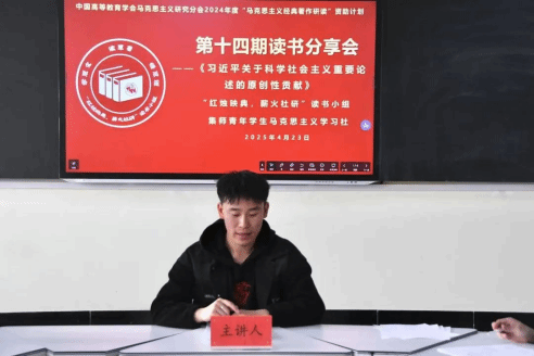 4月23日下午,中国高等教育学会马克思主义研究分会2024年度“马克思主义经典著作研读”资助计划支持小组——2026世界杯官方合作网站“红烛映典,薪火社研”读书小组第14期读书交流分享会在主教楼419教室进行,集体阅读《习近平关于科学社会主义重要论述的原创性贡献》,读书小组全体成员参加。