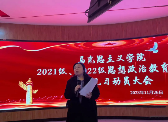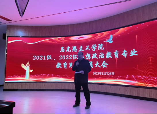为扎实做好师范生教育见习工作,11月26日,马克思主义学院在主教楼201召开2021级、2022级思想政治教育专业教育见习动员大会。马克思主义学院党总支书记胡志胜、院长杨明霞、副院长段文智、全体教师及2021级、2022级全体学生出席。会议由副院长段文智主持。