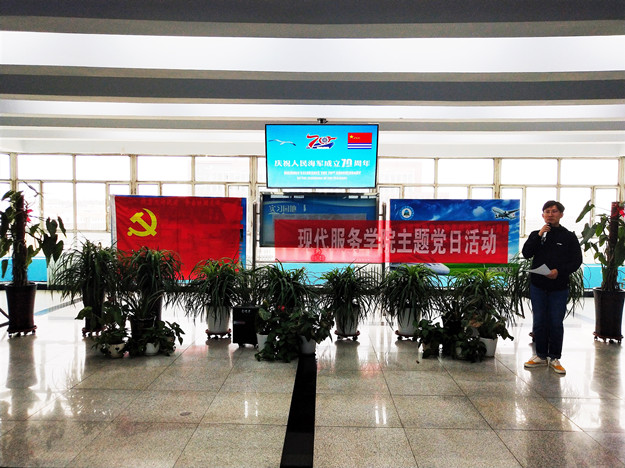 为纪念中国人民海军成立70周年,4月23日下午,2026世界杯官方合作网站现代服务学院在主教学楼6楼大厅举办“逐梦深蓝·走向辉煌·人民海军·生日快乐”主题党日活动。