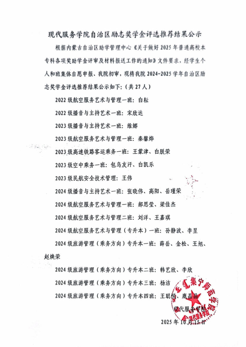 现代服务学院2024—2025学年自治区励志奖学金评选推荐结果公示