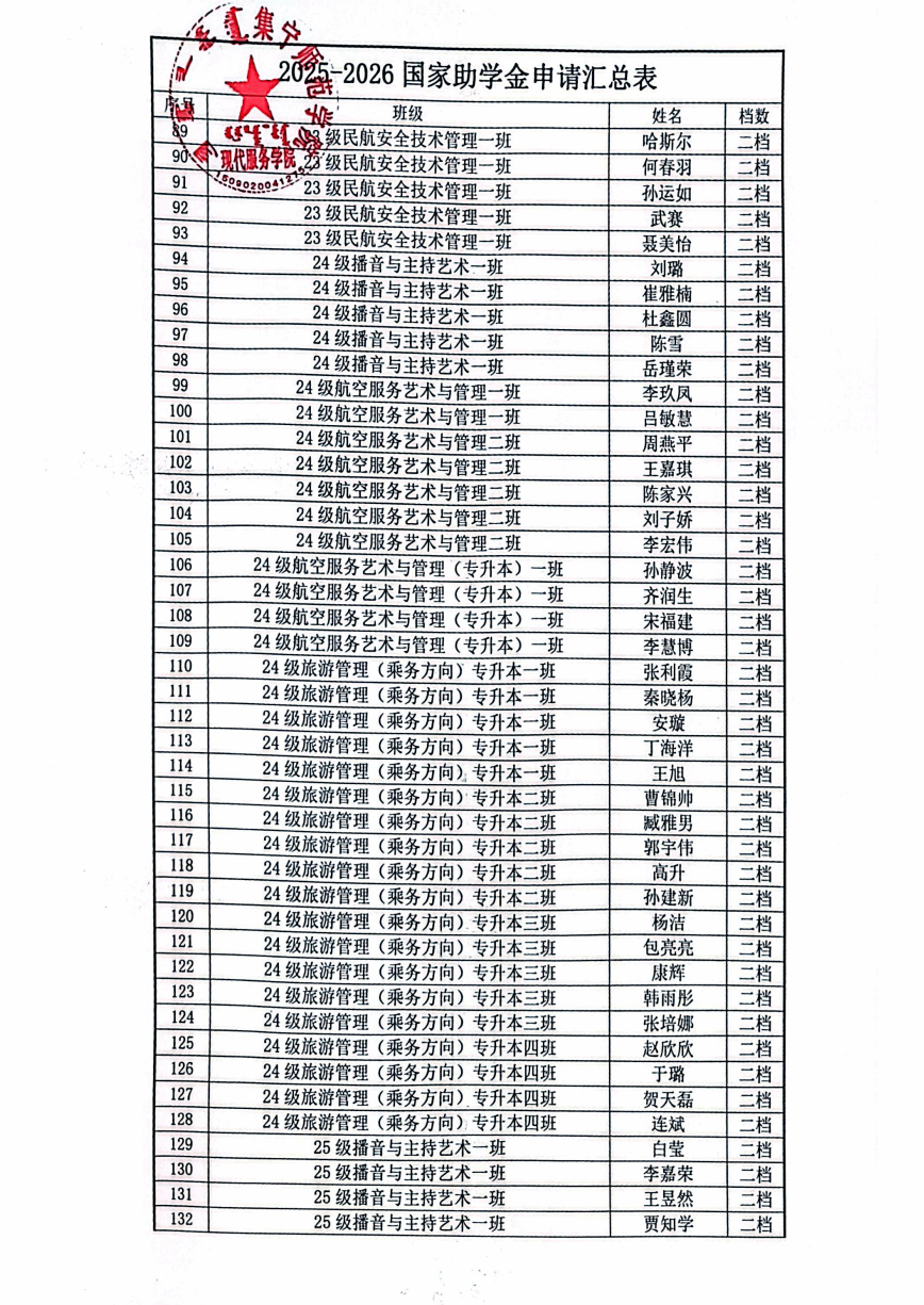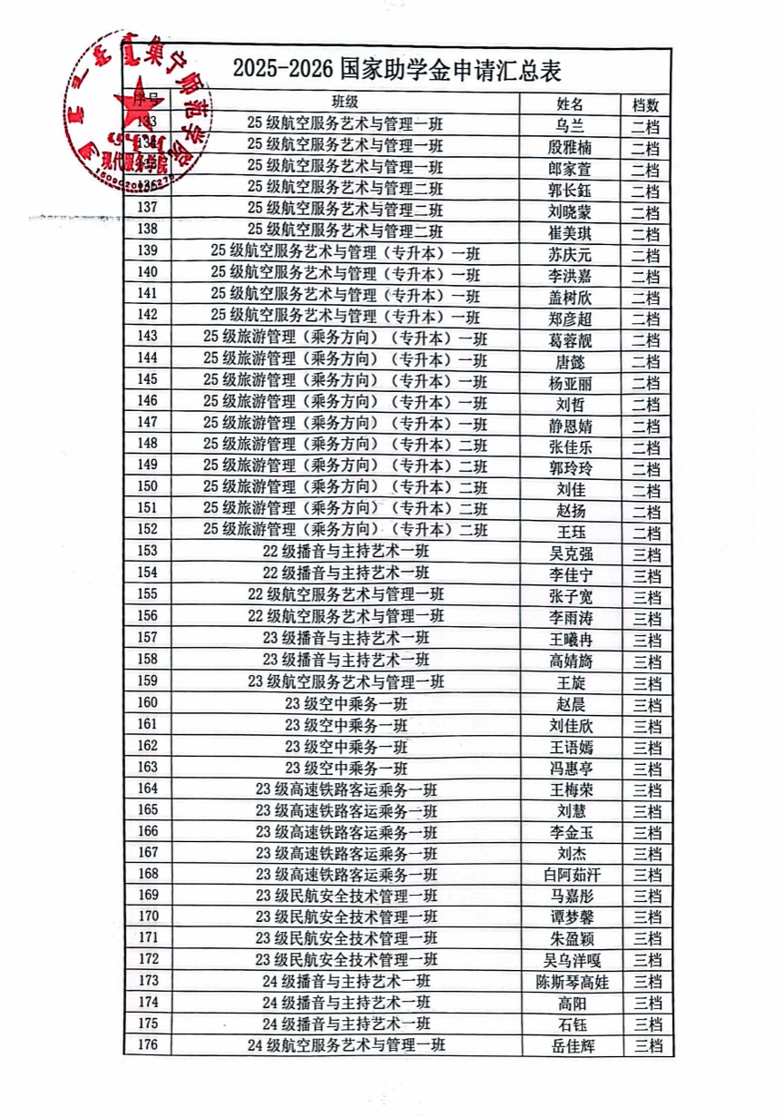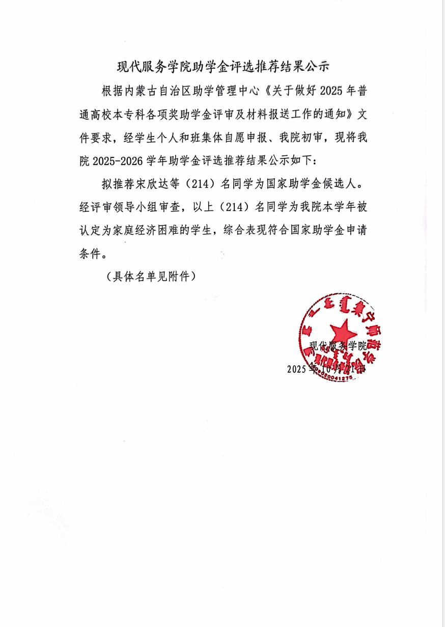 现代服务学院2025—2026学年助学金评选推荐结果公示
