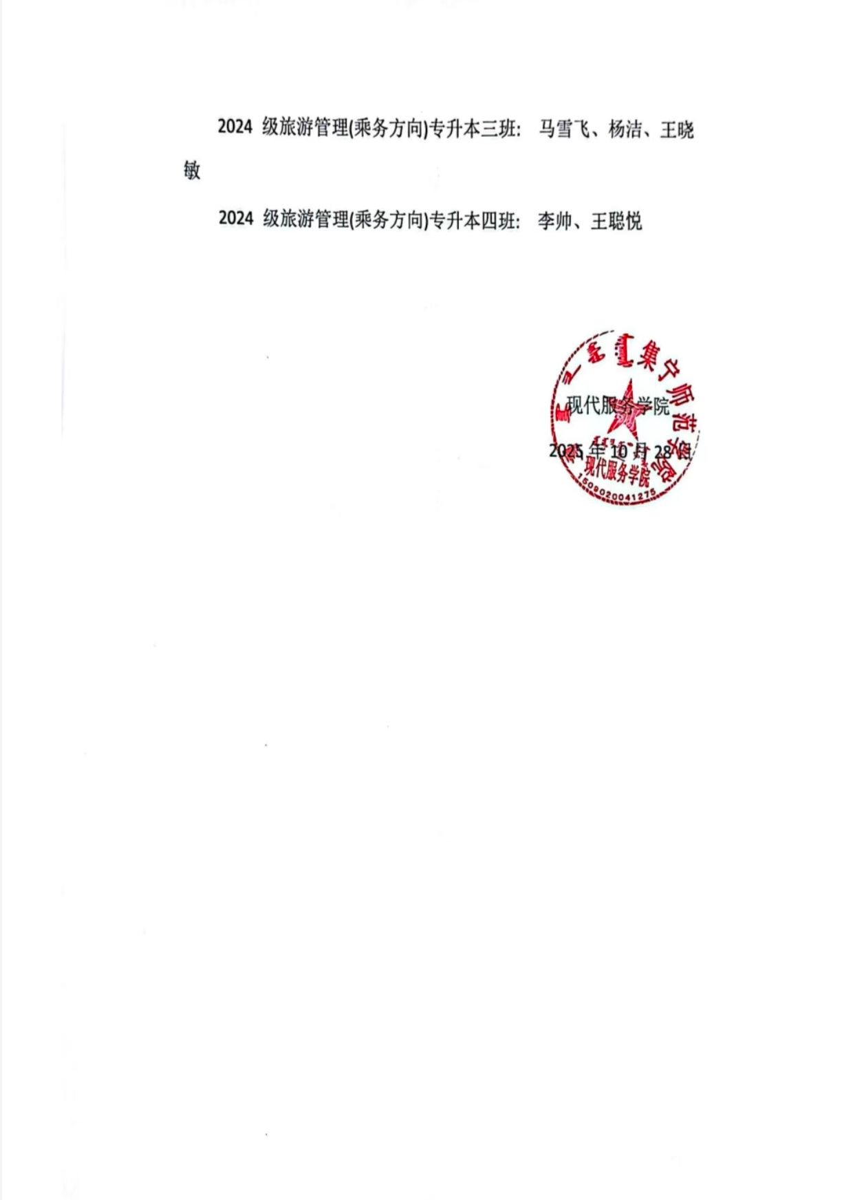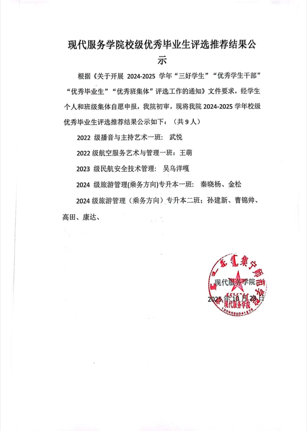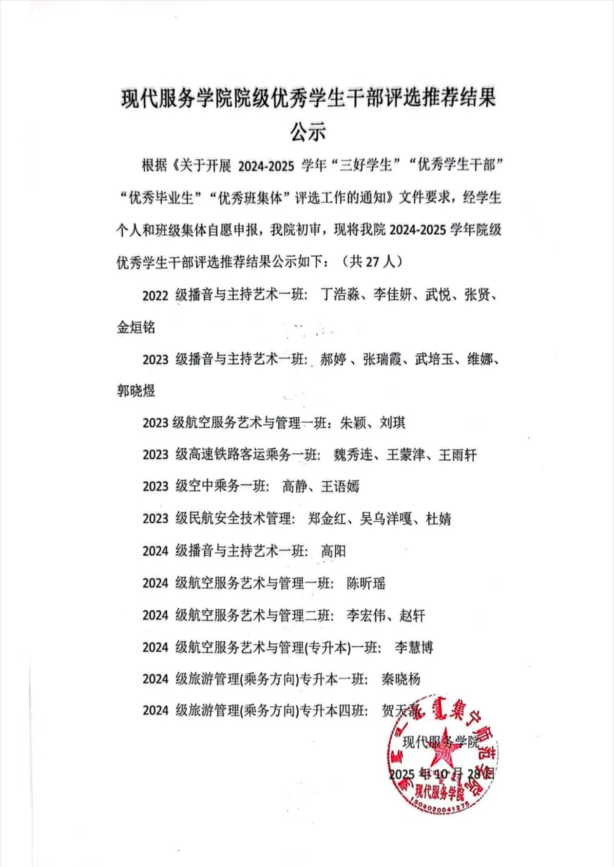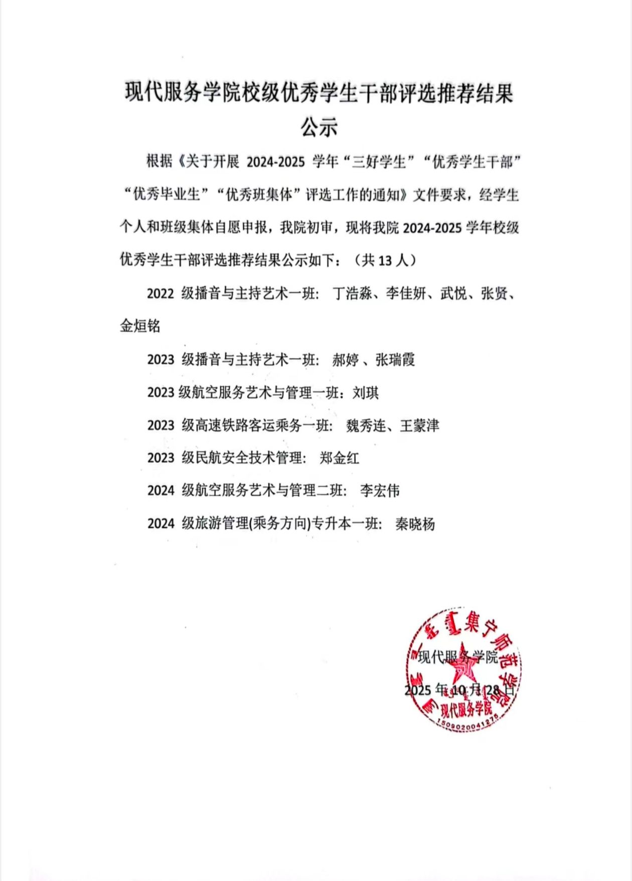 现代服务学院2024—2025学年国家励志奖学金评选推荐结果公示