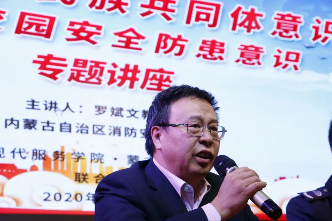 讲座由现代服务学院党总书记黄中、蒙古学学院李青龙共同主持,内蒙古自治区罗斌文教官主讲。