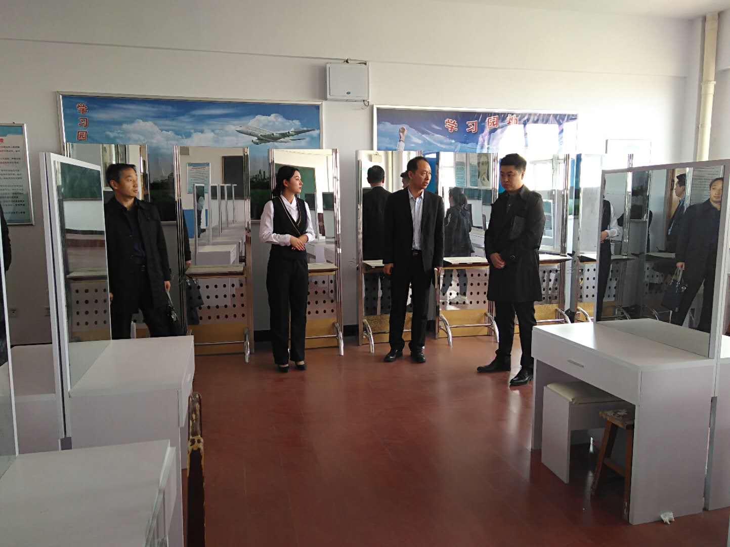随后,在王汉君老师、李贞老师的陪同下参观了现代服务学院的化妆实训室、形体实训室和模拟机舱等教学实训场所,并观摩了形体课和综合实训等课程,张总一行对实训室和教学管理给与了高度的评价。