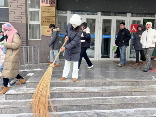 本次扫雪活动中,现代服务学院的同学们用实际行动践行了党的二十大的精神内涵,诠释了奉献、友爱、互助、进步的志愿服务精神,充分展现了当代大学生的社会责任感与担当精神,在这严冬里他们以实际行动为同学们带来温暖的关爱。