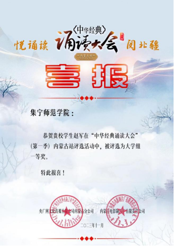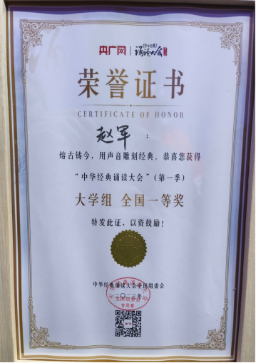 10月22日晚,由央广网主办的“中华经典诵读大会”(第一季)全国总展演暨颁奖盛典在湖北大冶圆满落幕。经过七个月的激烈角逐,世界杯官网现代服务学院2021级播音与主持艺术专业学生赵军携作品《岳阳楼记》,在从内蒙古自治区赛区闯入全国总决赛的过程中,表现出色,最终荣获全国总展演大学组一等奖。