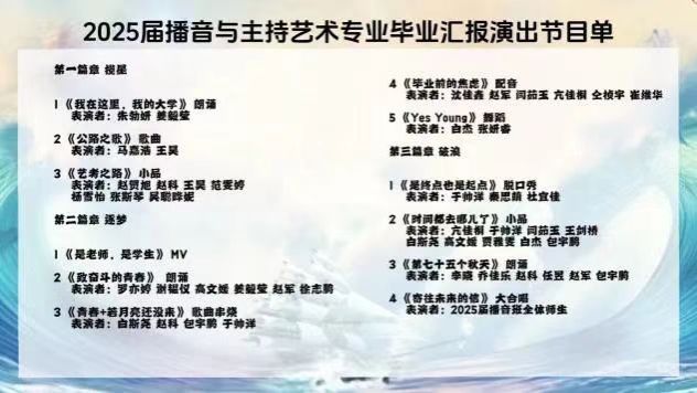 天籁和声,2025届播音班全体师生大合唱,共绘青春画卷,共忆美好时光。自此,此次毕业汇报演出落下帷幕。他们的所有节目中表达了对未来的憧憬和对母校和老师的不舍;他们的声音坚定而有力,充满了对未来的信心和勇气。