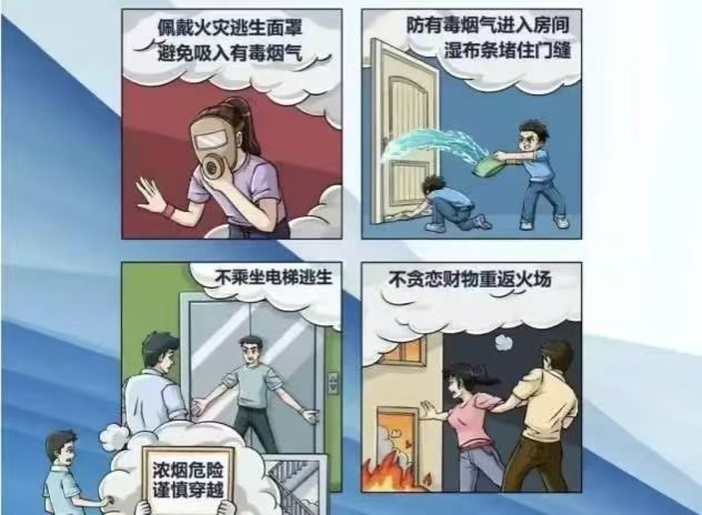 掌握正确的疏散方法,如遇火灾时保持镇静,用湿毛巾捂住口鼻,低姿势快速撤离。