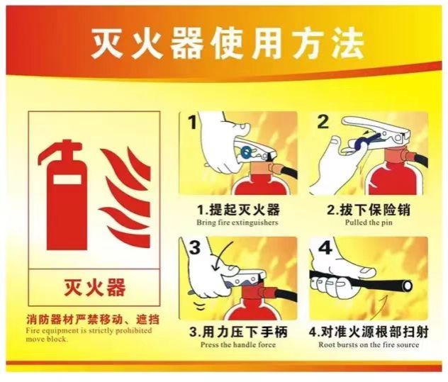 学会使用灭火器和其他简易灭火工具扑灭初期火灾。能够识别并使用适合不同类型火灾的灭火器。首先,记住四字口诀“提、拔、握、压”;一提:提起灭火器摇一摇;二拔:拔出灭火器的保险销;三握:握住喷管对准火焰根部;四压:保持适当距离,按压手柄(一般4-5米,干粉2-3米)