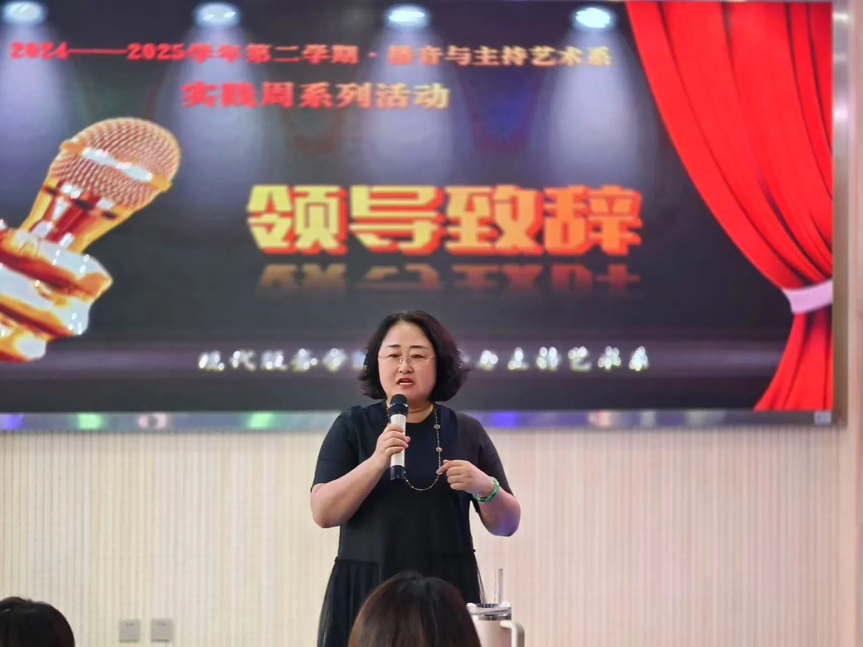 为深入贯彻“以学生为中心”的教学理念,落实立德树人根本任务,现代服务学院播音与主持艺术系于6月25日隆重举办了“播音生基本功大赛”,作为播音专业实践周的重要环节之一,本次活动不仅是一次教学成果的检阅,更是一次师生共同参与、协同成长的教学实践探索。大赛邀请王晓玉、沈佳雯、宝力、吕雅玲四位专业教师担任评委,党总支书记李荣利、副书记毛慧、副院长刘春芳作为嘉宾出席观赛