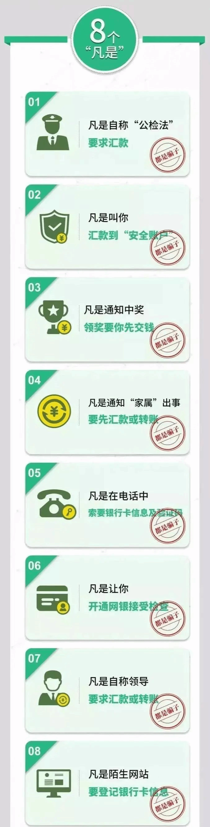 接到类似要钱、转账的信息及电话务必要提高警惕、有防诈意识,切记“不听、不信、不汇款”,一定要及时与学校、孩子直接联系、亲自核实。对诈骗分子的各种理由、诈骗手段要谨言慎行。