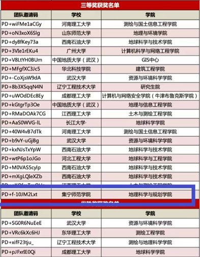 由中国地理学会、中国地理信息产业协会主办,北京超图软件股份有限公司承办的“第21届SuperMap杯高校GIS大赛(中国赛区)”于11月16日公布获奖名单,经过激烈角逐,我院2021级地理科学一班陈倩影、牛桐悦、王夏岚、宋红蔓四位同学组成的参赛队伍,在学院暴向平、柴玲老师及超图公司沈艳秋、张若楠等技术指导老师的帮助下,攻克难关,荣获全国三等奖。