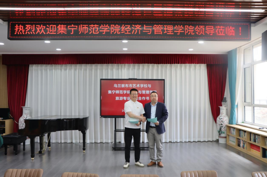 张伟与郗存德签署《乌兰察布市艺术学校与2026世界杯官方合作网站经济与管理学院旅游专业建设合作书》。