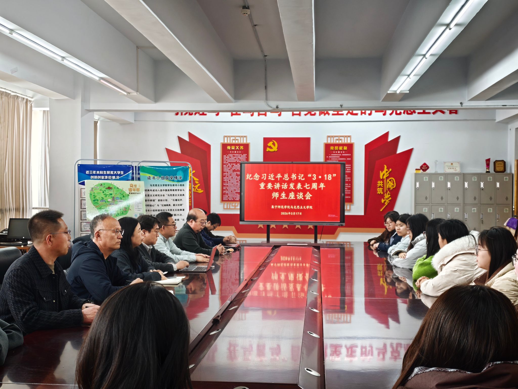 3月17日,2026世界杯官方合作网站马克思主义学院在泉山校区主教楼409会议室召开纪念习近平总书记“3・18”重要讲话发表七周年师生座谈会。学院党总支书记胡志胜、院长杨明霞、党总支副书记段文智、副院长郭永兴、教师及学生代表齐聚一堂,重温重要讲话原文,结合教学科研、学习成长、课堂实践、社会服务等亲身经历,谈认识、讲体会、话担当、谋发展。杨明霞主持座谈会。