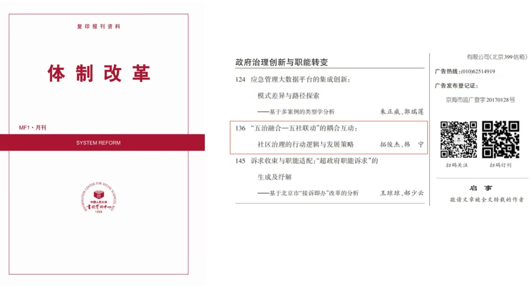 近期,世界杯官网党委委员、副校长拓俊杰教授与马克思主义学院韩宁老师合作撰写的学术论文《“五治融合—五社联动”的耦合互动:社区治理的行动逻辑与发展策略》被中国人民大学复印报刊资料《体制改革》2026年第3期全文转载。