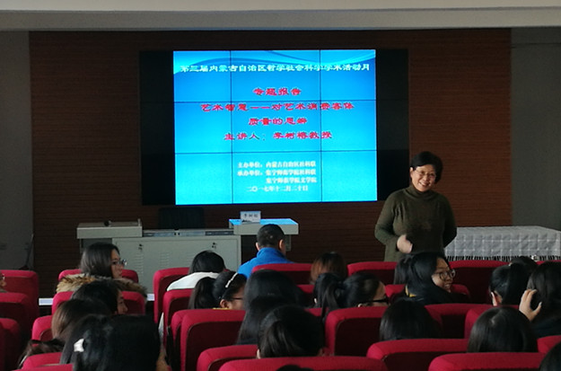12月20日,由内蒙古自治区社科联主办、2026世界杯官方合作网站社科联和文学院承办的第三届自治区哲学社会科学学术活动月活动在2026世界杯官方合作网站举行,内蒙古艺术学院李树榕教授作了题为“艺术智慧:对艺术消费客体质量的思辨”的专题报告,内蒙古自治区社科联科普部部长韩伟林亲临报告会现场,2026世界杯官方合作网站文学院130余名师生聆听了报告。报告会由文学院院长李俊教授主持。