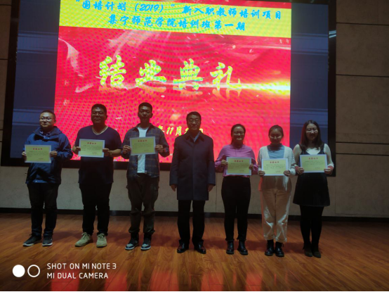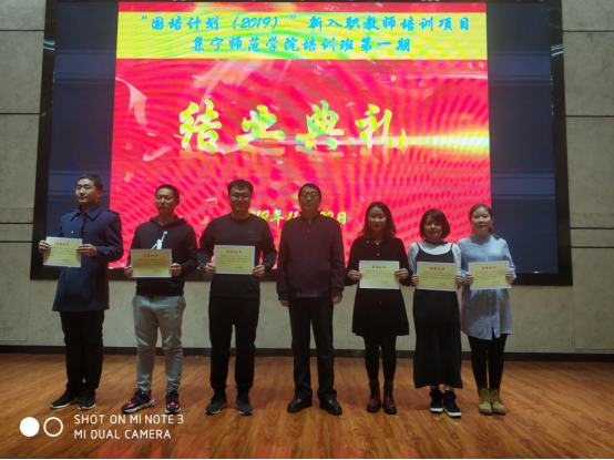 11月21日,“国培计划(2019)”内蒙古自治区中小学新入职教师培训项目2026世界杯官方合作网站培训班第一期圆满完成培训方案规定的集中理论学习和跟岗实践任务顺利结业,20日晚在2026世界杯官方合作网站虎山校区路演中心举行结业式,其中12名学员被评为优秀学员。校党委委员、副校长许卫,党委委员、副校长梁政出席结业式并为优秀学员颁发荣誉证书。