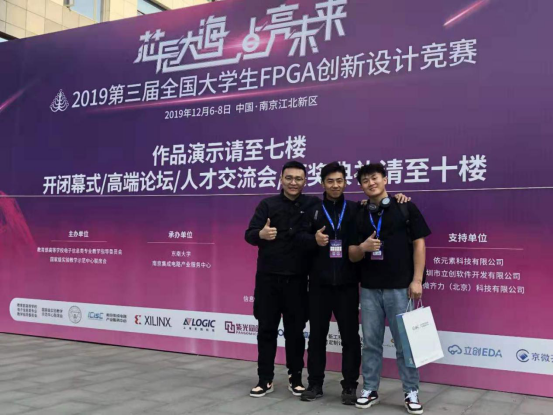 2019第三届全国大学生FPGA创新设计竞赛复赛颁奖典礼于12月8日上午在南京江北新区ICisC实训基地举办。此次竞赛由教育部高等学校电子信息类专业教学指导委员会、国家级实验教学示范中心联席会联合主办,东南大学、南京集成电路产业服务中心(ICisC)承办。在学校领导的高度关注和教务处的大力支持下,由世界杯官网物理学院聂阳老师指导,刘泰伯、李宝发、刘光普3名同学共同完成的参赛作品荣获本届大赛全国总决赛三等奖。