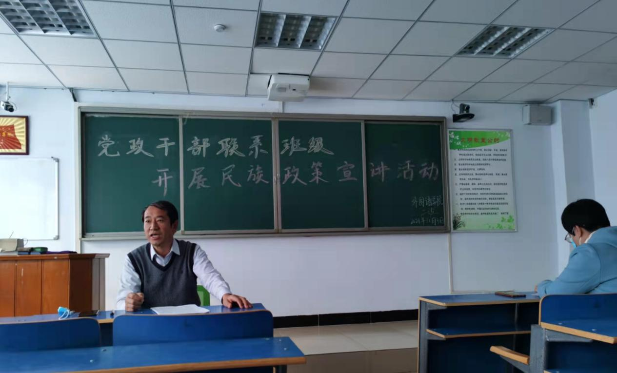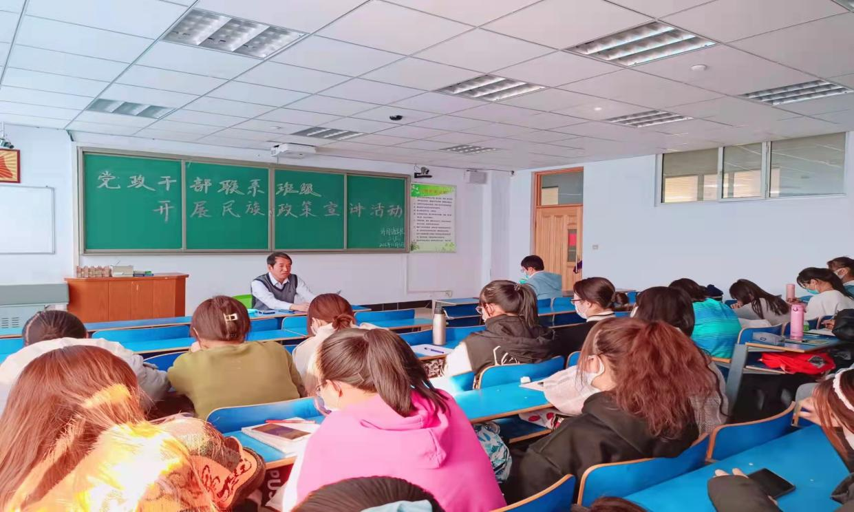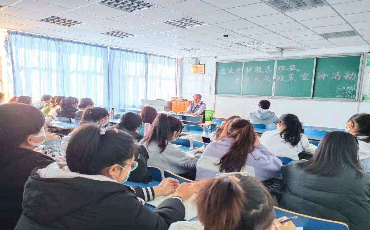 11月3日上午10点,兰立新深入外国语学院2021级英语专业2班为学生开展民族政策宣讲。兰立新从促进民族团结进步的重要意义;如何开展民族理论学习;解读《内蒙古自治区促进民族进步团结条例》三个方面进行讲解。兰立新用具体的案例解析民族政策,课堂内容生动、气氛活泼。
