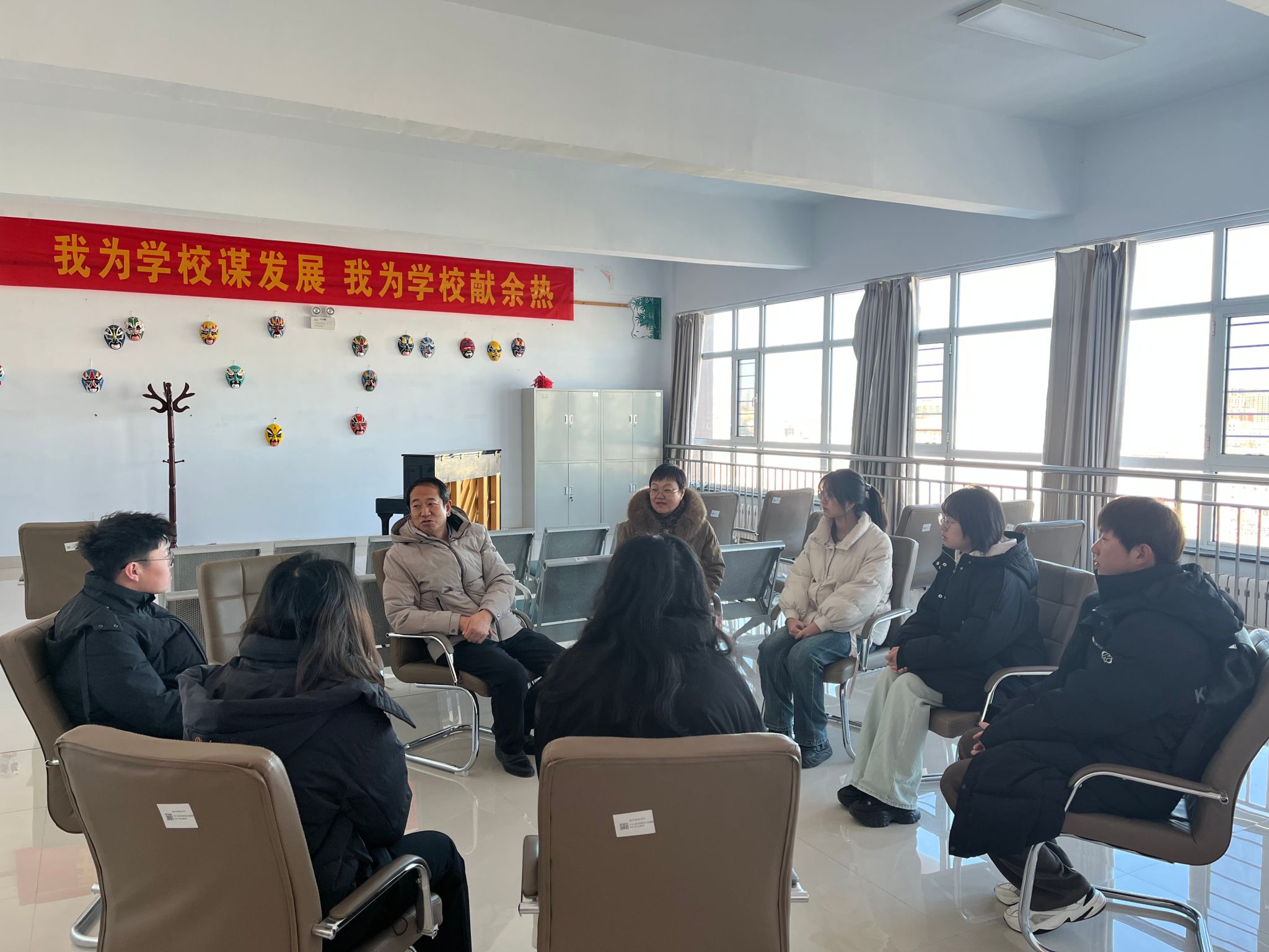 交流中希望同学们珍惜在学校的宝贵时间,认真学习,积极参加活动,把握住时机,在学校期间把能取得的各类证书尽可能取得,为以后走向社会打好基础。其次,希望同学们利用课余时间练习书法,在练就一笔好字的同时还能修身养性,消除内心的浮躁,管好自己的情绪。第三,希望同学们在学校期间保持联系,与老师们分享学习生活的快乐,有困难及时沟通,大家共同解决相互促进。