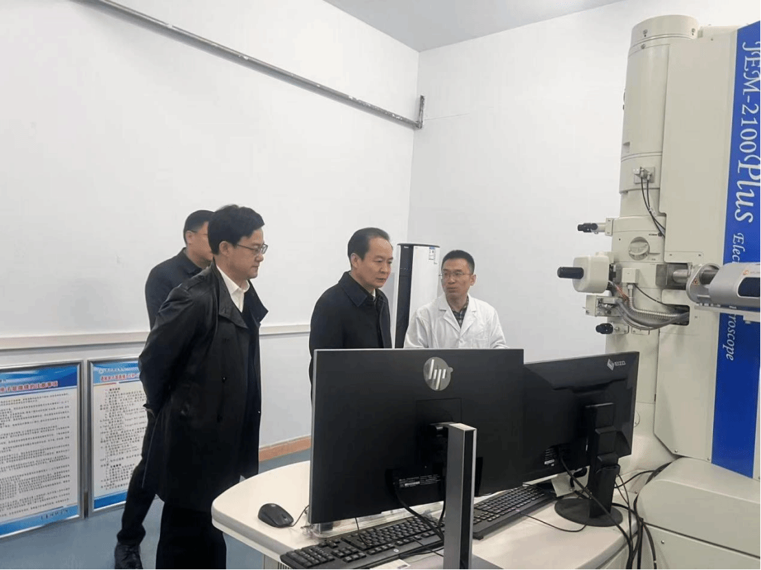 内蒙古自治区教育厅党组书记、厅长杜汇良考察石墨烯研究院透射电镜实验室听取孟祥锋博士讲解透射电镜功能原理