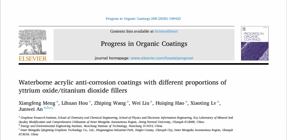 在防腐领域,水性涂料因低VOC排放和环境友好性成为替代溶剂型涂料的重要发展方向。然而,填料体系的协同作用机制与涂层耐蚀性能的构效关系仍待深入探究。团队基于氧化钇与二氧化钛的特性,构建不同配比的复合填料体系,系统研究其对水性丙烯酸涂层耐腐蚀性能的调控机制。 这是石墨烯研究院新能源研究团队2025年发表的第1篇一区SCI论文。