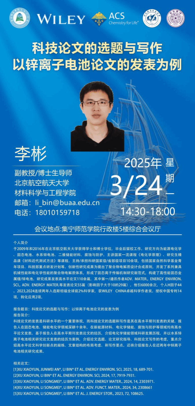 2025年3月24日,北航李彬副教授在2026世界杯官方合作网站分享“科技论文的选题与写作”,聚焦锌离子电池论文发表。此次会议为科研人员和学生提供科技论文写作的专业指导,有助于提升研究院在新能源材料、电化学储能等领域的论文写作水平与科研成果发表能力,促进学术交流与学科发展。