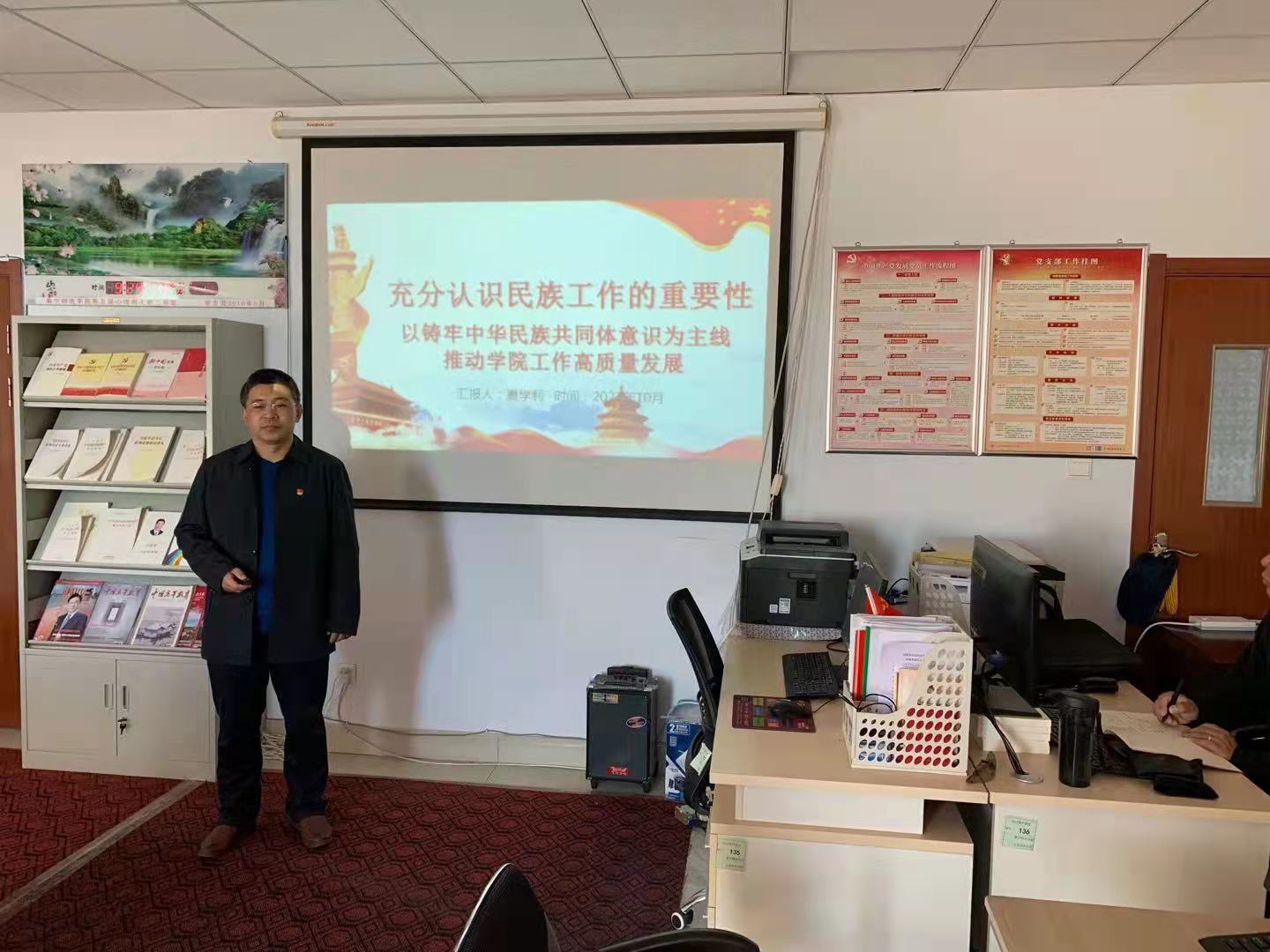 夏学利从“增强对中华民族高度认同、各民族共同奋斗一起发展、民族平等团结听党话跟党走、做好民族工作促进学院发展”四各方面阐述了铸牢中华民族共同体意识、充分认识民族工作重要性等内容。