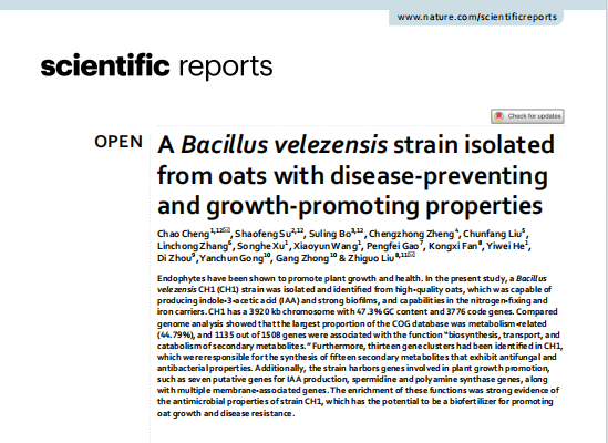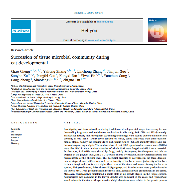 近日,我院生防菌研制团队联合内蒙古农牧业科学院黑土地保护与利用团队分别在国际知名期刊《Heliyon》(Cell子刊)及《Scientific reports》(Nature子刊)上发表了题为“Succession of tissue microbial community during oat developmental”和“A Bacillus velezensis strain isolated from oats with disease-preventing and growth-promoting properties”的研究论文。我院教师程超为第一作者及第一通讯作者,我院2020级生物科学专业2班张雅红同学和内蒙古农牧业科学院苏少锋副研究员分别为共同第一作者。