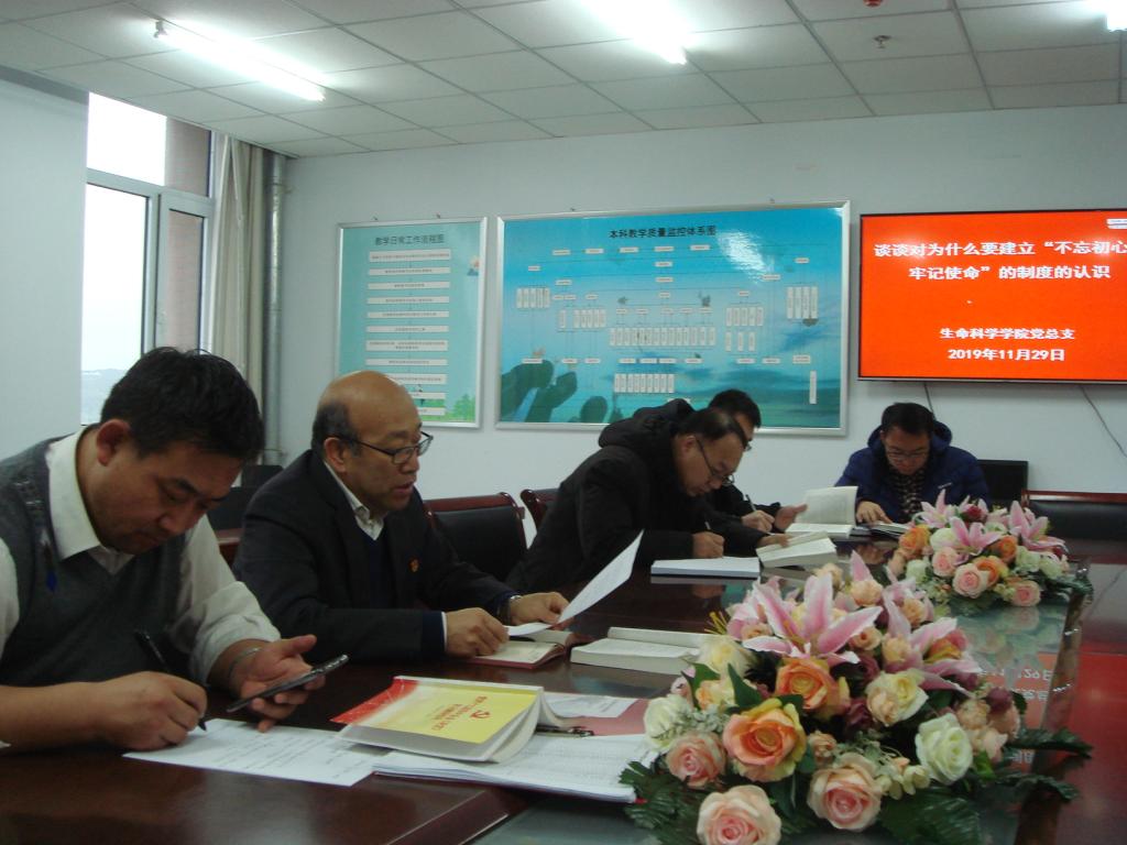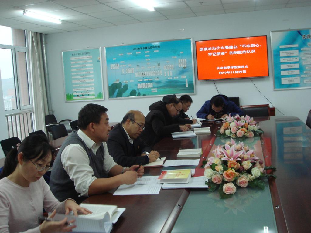 根据学校党委工作部署与安排,生命科学学院党总支理论学习中心组于2019年11月29日上午在逸夫楼2Y707会议室举行会议,传达学习贯彻党的十九届四中全会精神乌兰察布市宣讲团报告会内容,交流研讨建立“不忘初心、牢记使命”制度的认识。党总支书记曹兴明主持会议。
