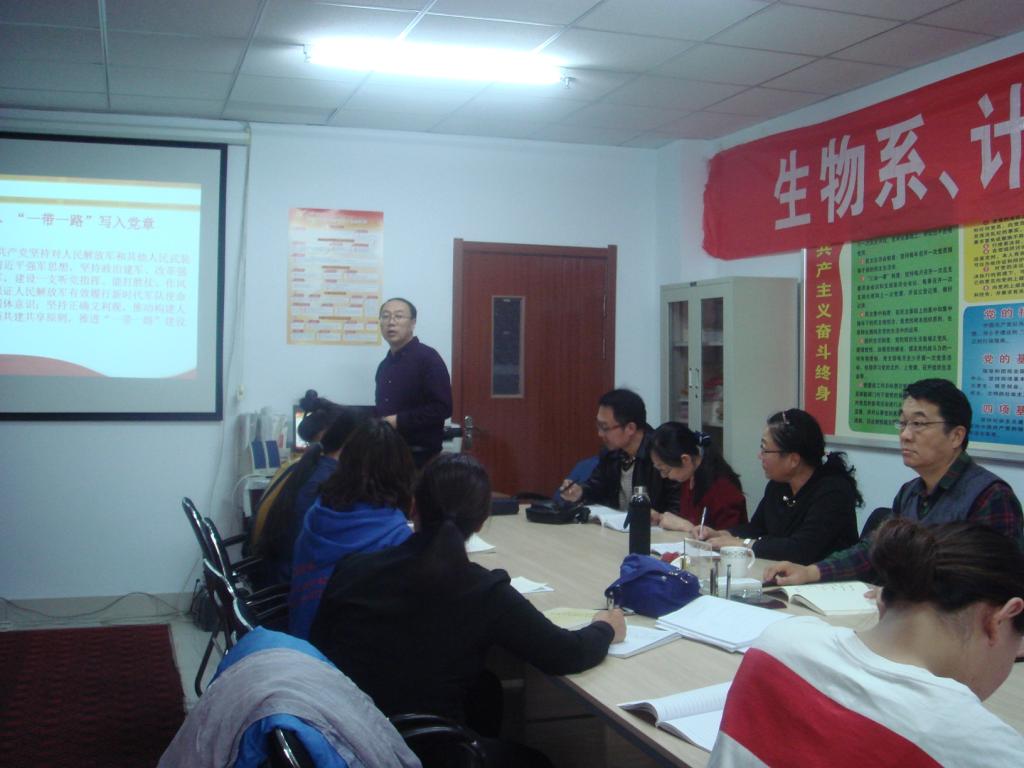 为深入学习宣传贯彻党的十九大精神,教育引导师生把思想和行动统一到十九大精神上来,11月16日下午,生物系党总支举行党的十九大精神专题学习会议,校党委委员、副院长许卫和生物系师生党员一起参加了学习。会上,生物系教工支部书记穆俊祥通过讲党课的形式同大家一起学习了党的十九大修改后党章的新内容。