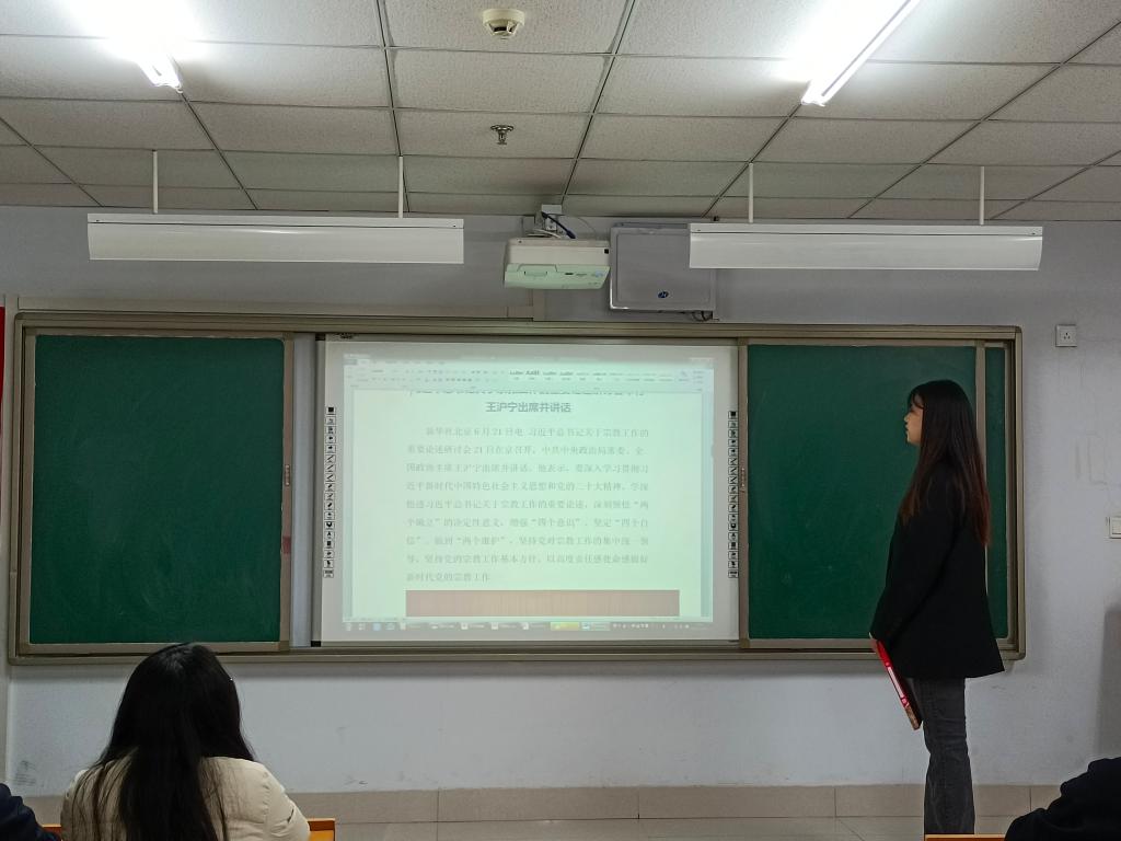 2021级园艺一班团支部书记金彩娇带领同学们学习习近平总书记关于宗教工作的重要论述,并观看了反邪教的相关视频。