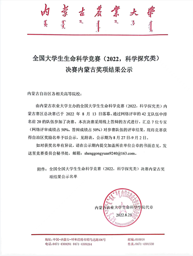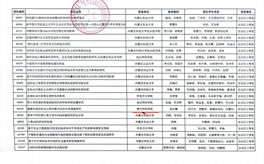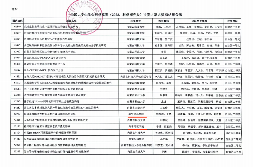 我院周萌洋等15名学生在2022年全国大学生生命科学竞赛(科学探究类)中荣获自治区二等奖两项、自治区三等奖一项。