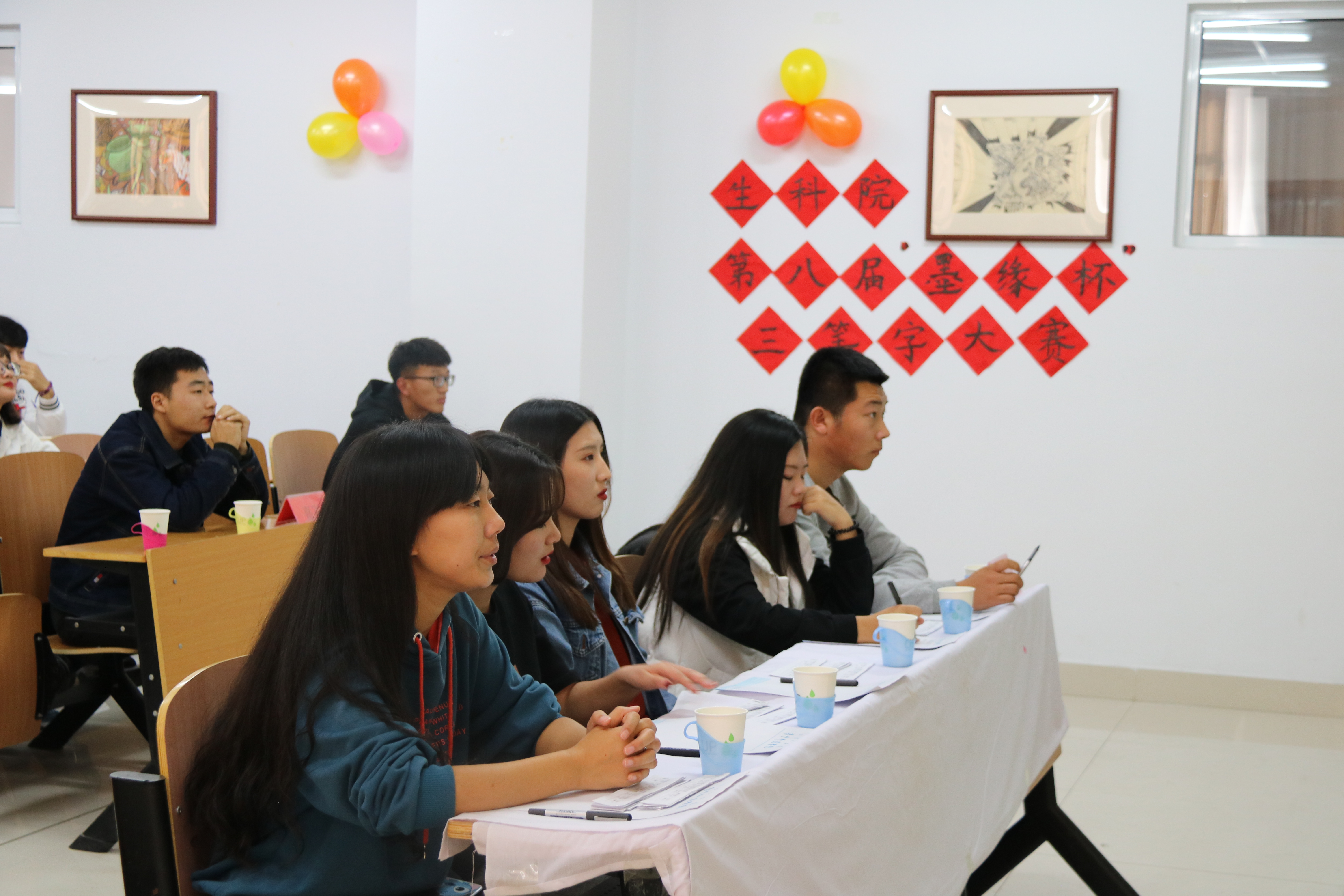 为弘扬优秀传统书写艺术,增强大学生写好三笔字意识,提高书写三笔字技能,生命科学学院于2019年10月31日14时在逸夫楼109室成功举办第八届“墨缘杯”三笔字大赛。担任本次大赛的评委有物理学院学生会主席马焱峰、化学与化工学院学生会主席李文杰、现代服务学院学生会主席于红飞、经济与管理学院学生会副主席王亚楠和计算机学院学生会副主席何爽。出席本次大赛的嘉宾为各院代表。