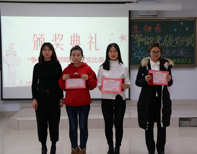 为提高学生网络安全意识,为十九大的召开营造更加干净的网络氛围,生物系于2017年11月25日19:00在逸夫楼201举办了“争做北疆好网民”征文比赛的颁奖仪式,出席本次颁奖嘉宾的有生物系团总支副书记张晓慧、生物系学生会主席王丽平、生物系学生会副主席王晓楠。