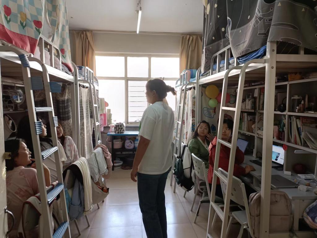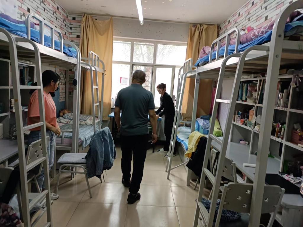 走访过程中,老师们与学生亲切攀谈,提醒他们重视寝室用电安全、内务整理等事宜。同时,对环境卫生较好、布置整洁的宿舍提出了表扬,对存在问题的寝室提出了整改建议和鼓励关切,并希望同学们能够加强自我管理,做好寝室卫生,重视寝室安全,营造良好的生活和学习环境,更好地助推学校文明建设。