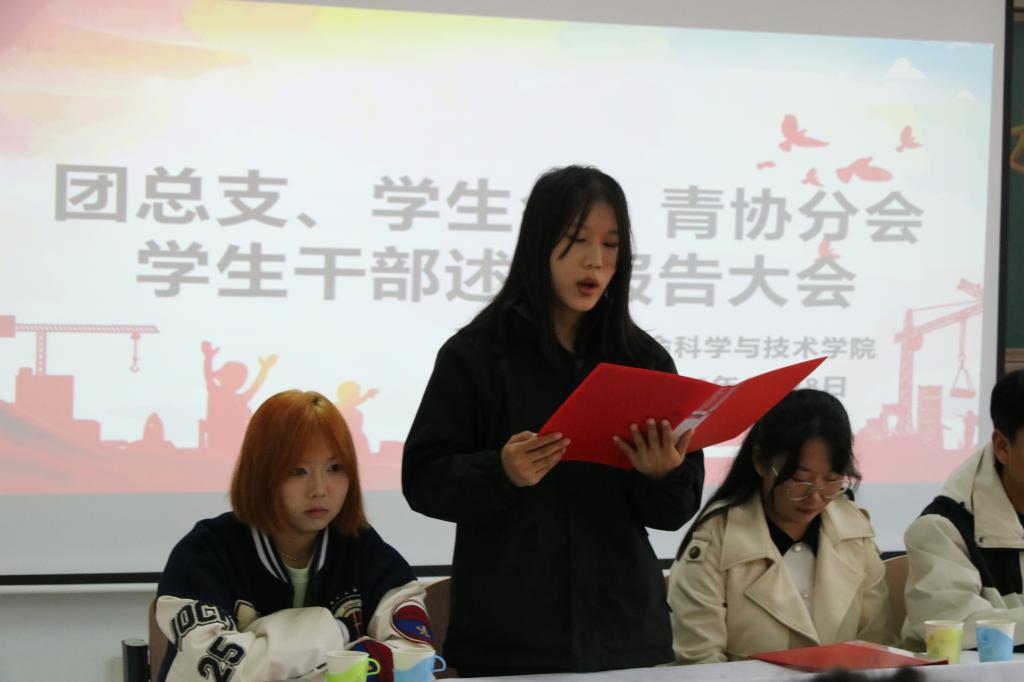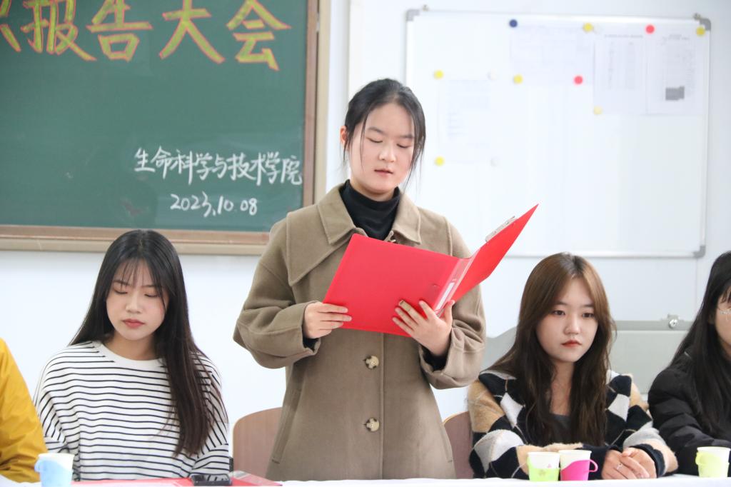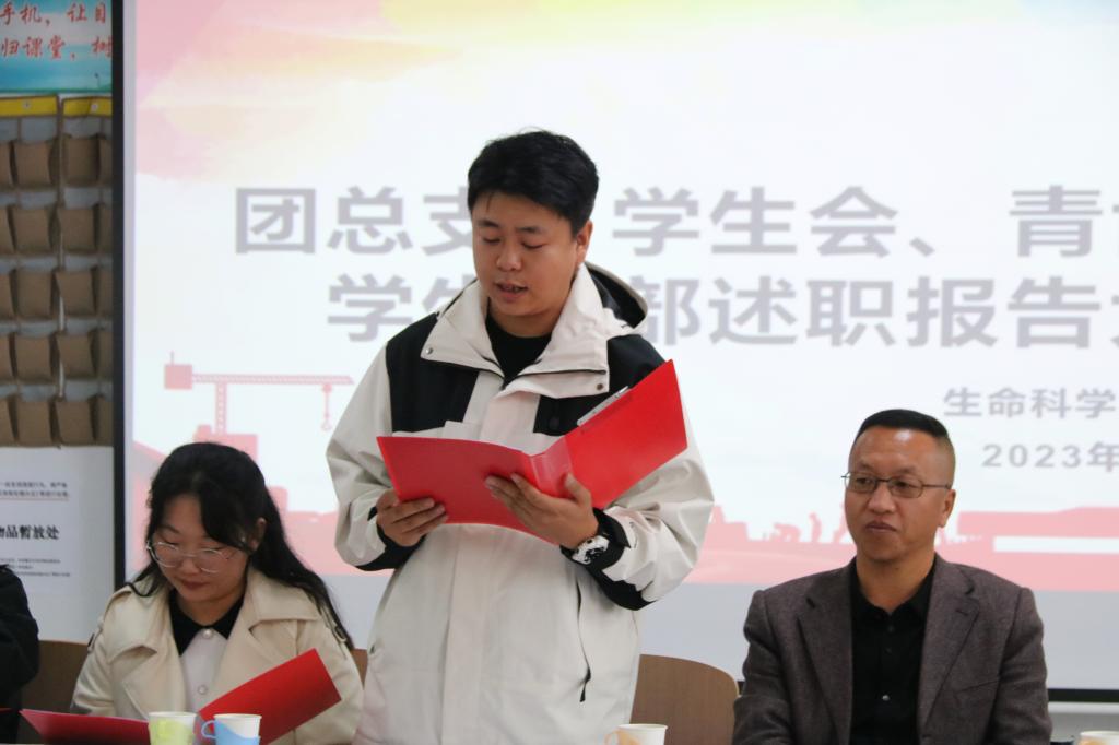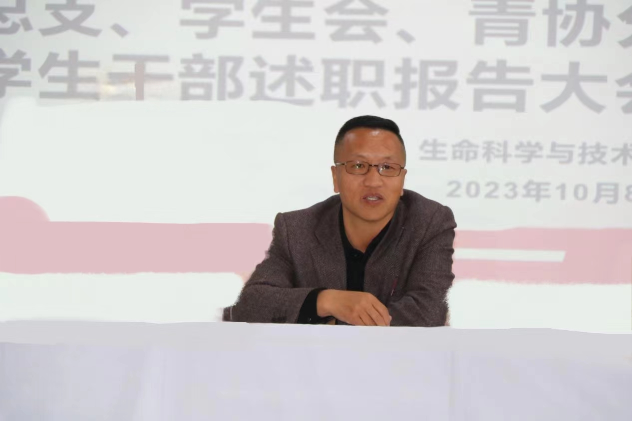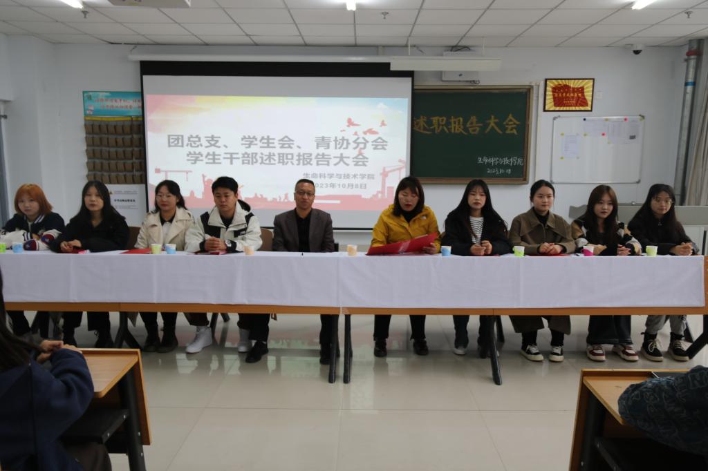 生命科学与技术学院于10月8日16时30分在逸夫楼201室召开了2023年度团总支、学生会、青协分会学生干部述职报告大会。参加本次会议的有学院党总支副书记张明东、团总支书记张荟及团总支、学生会、青协分会新老成员。