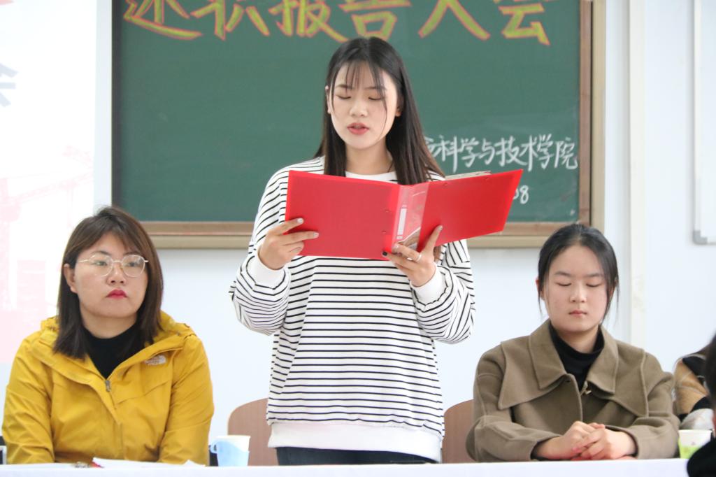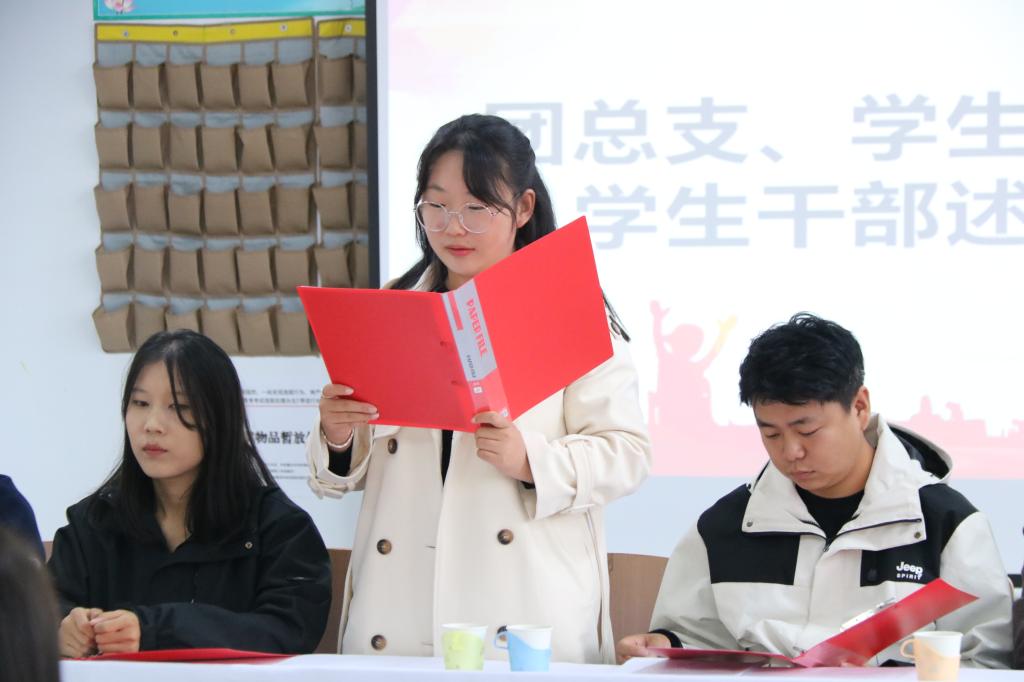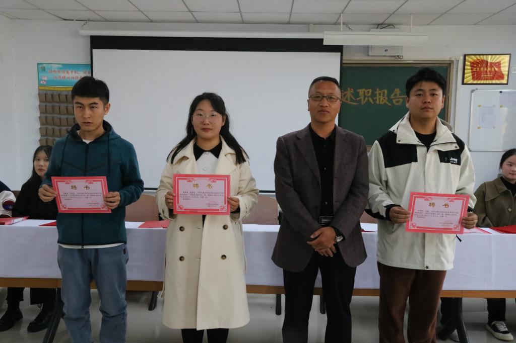 本次会议共五项议程,由张荟主持并依次进行。首先张荟宣读新一任学生干部成员名单。上一任团总支副书记朱崇瑶、学生会执行主席邱涛,青协分会理事长张志磊依次做述职报告,对他们在任期间所开展的工作做了详细总结,随后张明东为他们颁发了聘书。新一任团总支副书记张慧、学生会执行主席金彩娇、青协分会理事长侯佳雪依次代表全体新成员发言,对未来团总支、学生会、青协分会的工作做了展望和规划。