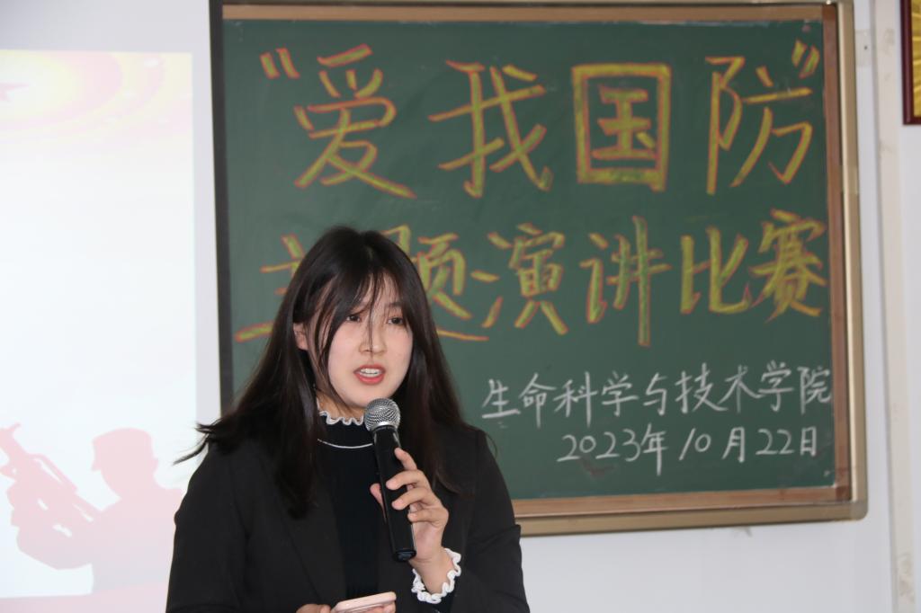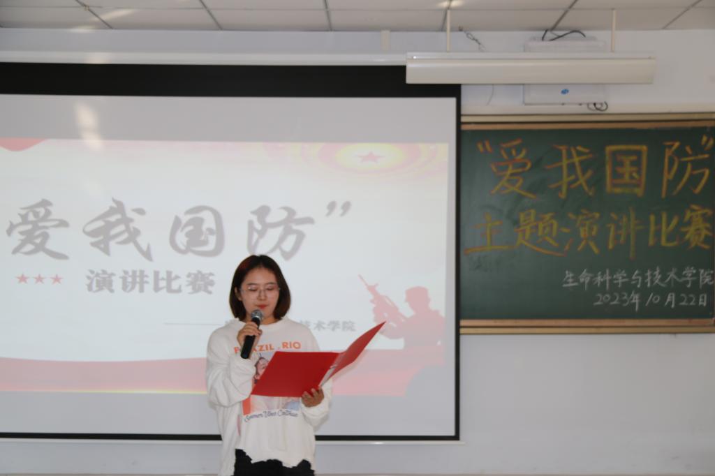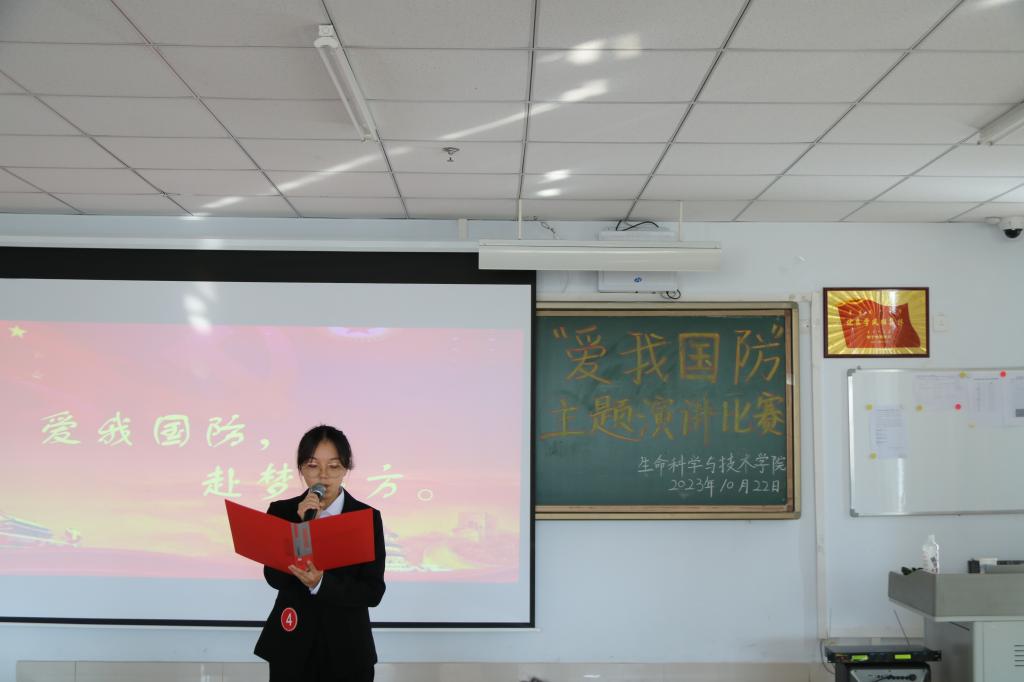 为深入学习贯彻党的二十大精神,贯彻落实习近平强军思想,不断增强国防教育的感召力和覆盖面,生命科学与技术学院于2023年10月22日在逸夫楼201室举办“爱我国防〞主题演讲比赛。本次活动邀请校学生会执行主席张一博、文学与新闻传播学院学生会主席团成员张媛媛和孙雅雯、我院团总支副书记张慧和学生会主席团成员马硕妍担任评委,我院学生会全体成员和各班级学生代表观看比赛。