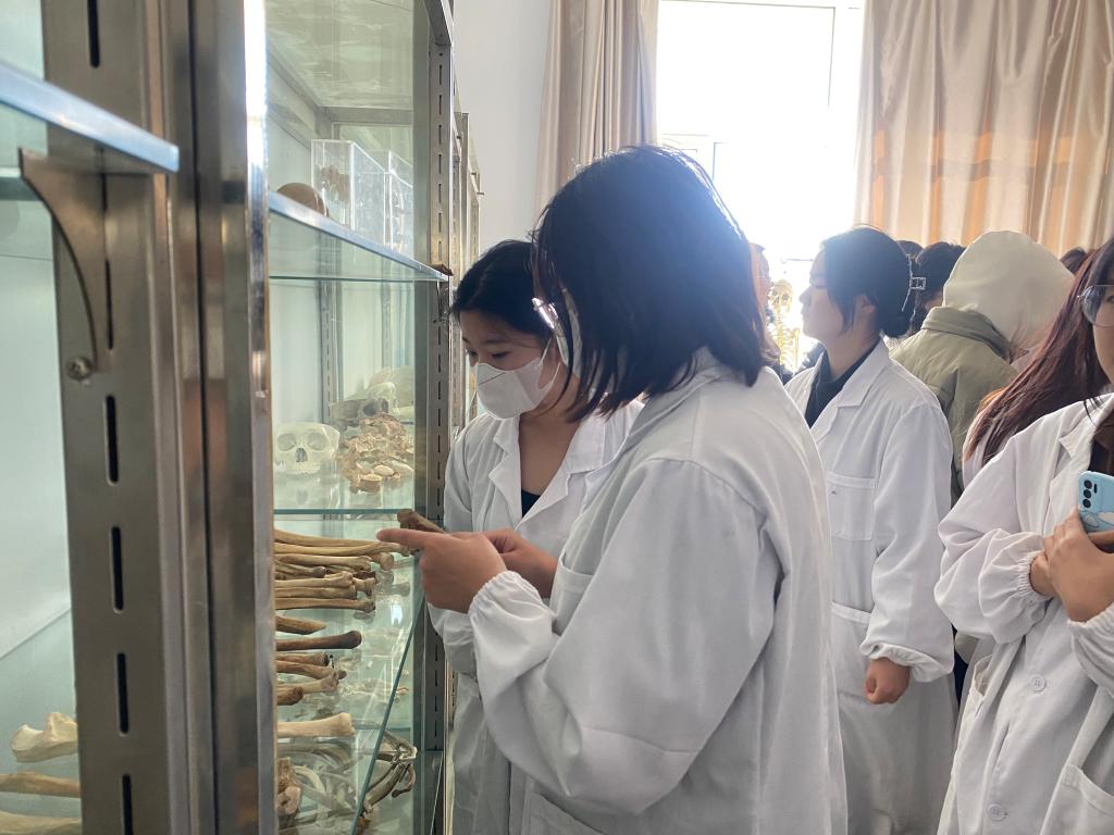 此次参观的标本包括人体器官标本、人体骨骼标本以及整体标本。人体解剖教研室主任刘一鑫老师为同学们讲解了人体骨骼组成,带领同学们观察内脏构成,并讲解呼吸器官、消化器官的相关结构,介绍了引起鼻炎、胰腺炎等病症的原因。
