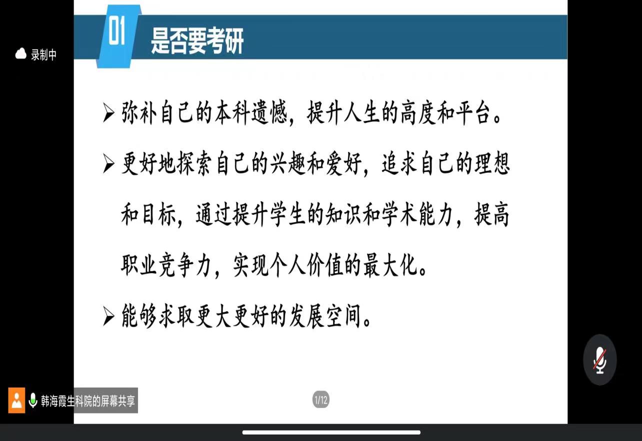 为帮助学生了解考研政策、考试内容和考试形式,解决备考中遇到的问题和困惑,提高备考效率和质量,生命科学与技术学院联合研究生院于12月21日下午15时线上线下同步开展了以“坚定信心规划未来,谈谈考研那些事儿”为主题的考研讲座。主讲人为我院任琴教授,世界杯官网有考研志愿的同学参加了本次讲座。