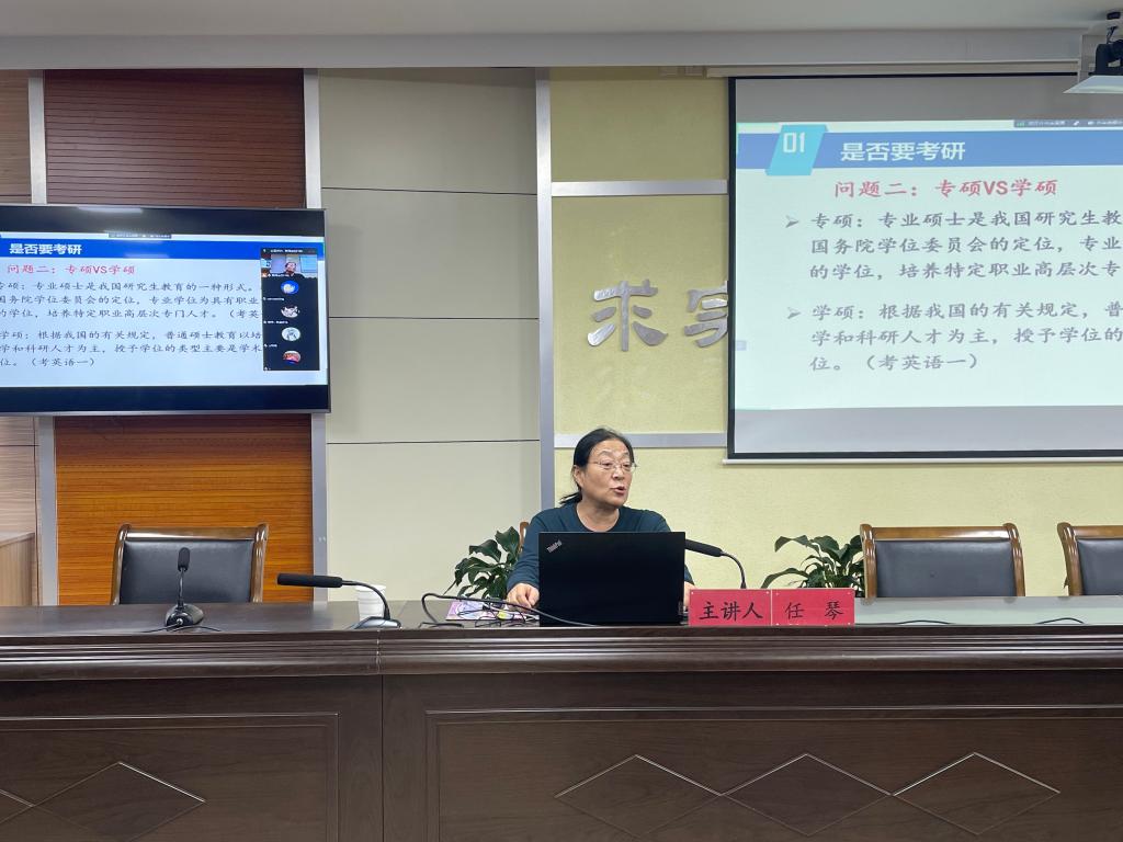研究生院院长张妙珠和副院长姚岭柏对主讲人和讲座内容进行简单介绍后,讲座正式开始,任琴老师在了解了大家的考研方向后介绍了近几年的考研情况,指出目前考研人数再创新高,竞争激烈,同学们更应提升自身能力;同时详细介绍了教育类专业考研需要复习的科目,帮助同学们进行教材分析和选择。她还嘱咐同学们一定要明确自己的考研方向,这样才能在考研路上一往无前。在任琴老师循循善诱的讲解和答疑中,同学们对考研的方向有了更加明确和深刻的认识。