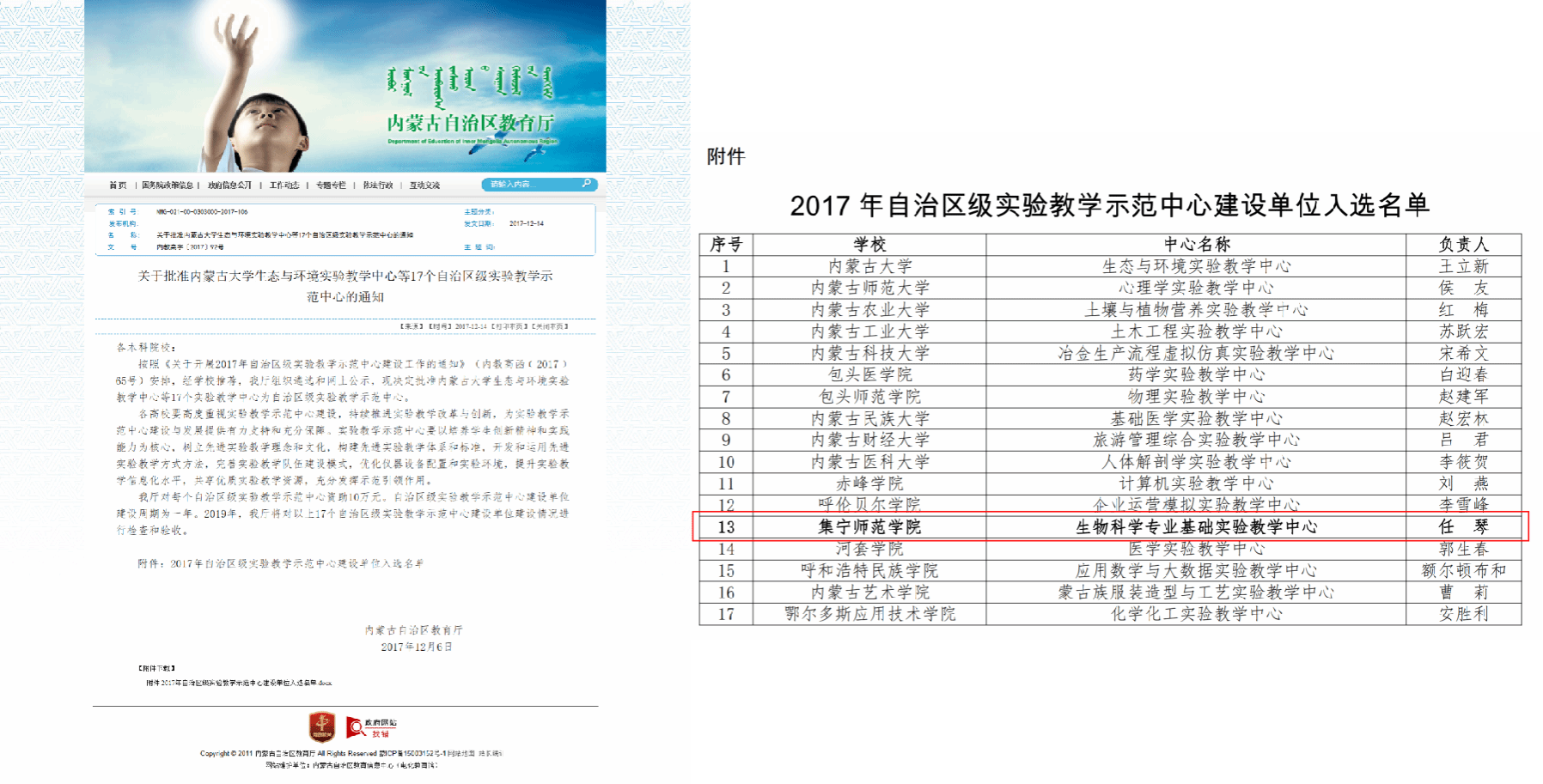 近日,内蒙古教育厅发布了《关于批准内蒙古大学生态与环境实验教学中心等17个自治区级实验教学示范中心的通知》(内教高字〔2017〕92号),我院生物科学专业基础实验教学中心成功获批2017年自治区级实验教学示范中心。