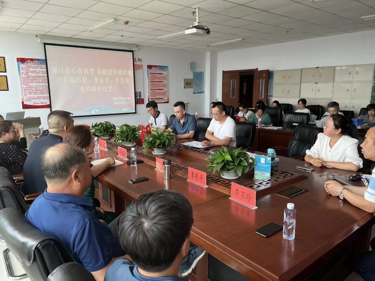 6月30日,数学与统计学院为退休教师沙仁格日勒、李东平、李万珍举办荣休仪式。离退休工作处处长常晓华、副处长马晓玉、综合服务科科长巩立红,人事处副处长吴炜,数学与统计学院全体教职工参加仪式,会议由数学与统计学院党总支书记张宏智主持。
