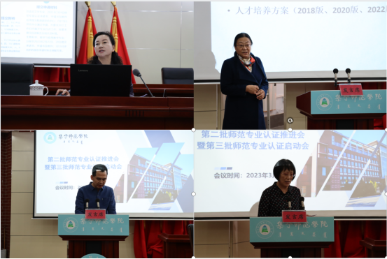 数学与统计学院院长何永峰、生命科学与技术学院院长任琴分别对本学院师范专业认证工作进展情况进行汇报,外国语学院院长闫晓云代表第三批师范专业认证学院作表态发言。