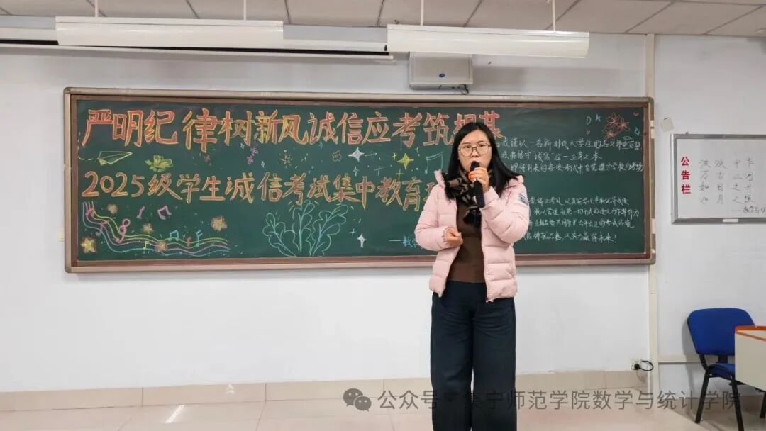 走进大学校园的第一次正式考试,对于每一位新生而言,都是成长路上的一道重要分水岭。12月29日,数学与统计学院于逸夫楼2Y301开展“严明纪律树新风,诚信应考筑根基”2025级学生诚信考试集中教育班会。我院党总支副书记常鑫、学团办公室副主任刘紫玉和班主任张瑜参与本次会议。