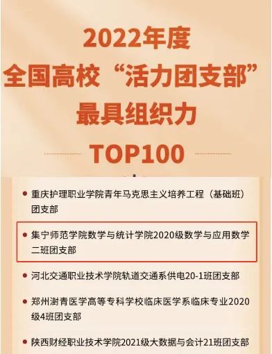 近日,团中央基层建设部指导中国青年报社开展2022年度高校“活力团支部”风采展示活动。世界杯官网数学与统计学院2020级数学与应用数学二班团支部围绕“支部政治功能突出,严格落实‘三会两制一课’,组织生活富有时代感、青年味,支部活动团员参与率高,组织动员能力好”等方面,经过校内选树、校级展示、省级展示、全国展示等环节入选2022年度全国高校“活力团支部”最具组织力TOP100。